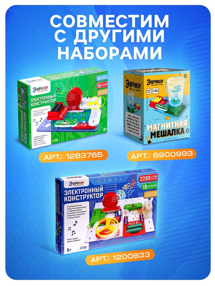 Экспериментируйте и создавайте электрические устройства самостоятельно. В наборах вы найдёте подробную инструкцию с описанием каждого шага. Конструктор «Эврики» предназначен для сборки различных простых электронных схем. Соединение элементов между собой производится с помощью специальных кнопочных креплений — это удобно, легко и быстро. Собранные схемы не требуют настройки и начинают работать сразу.