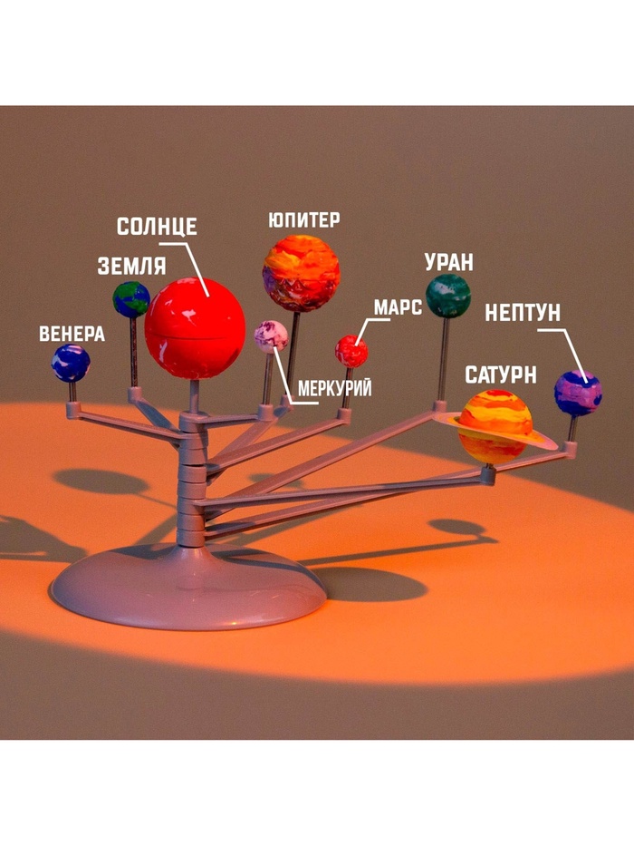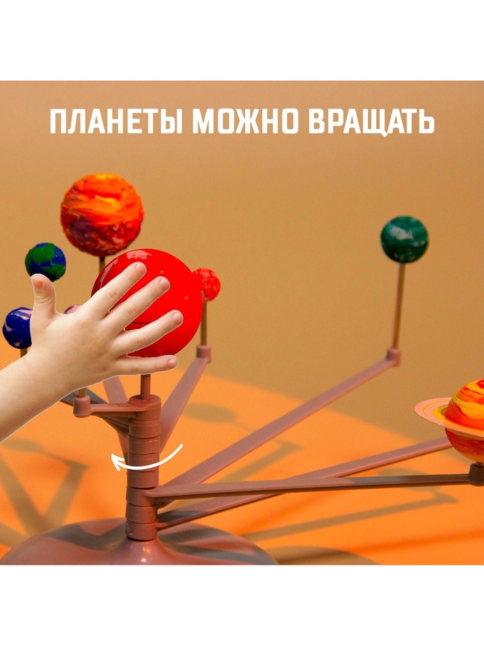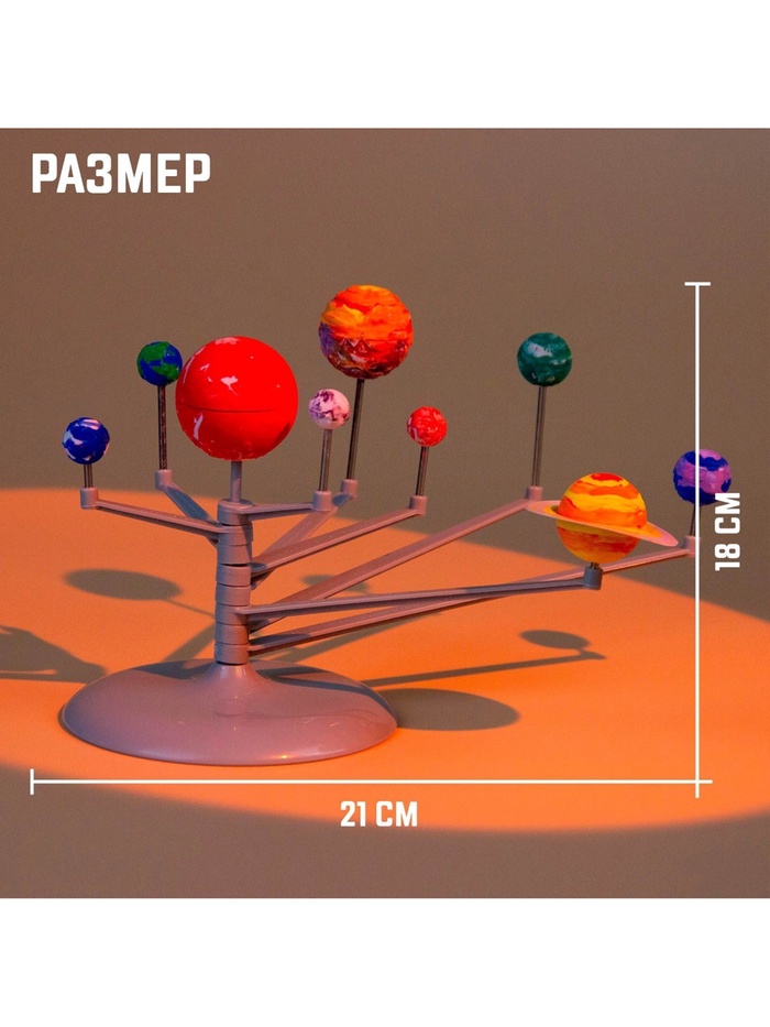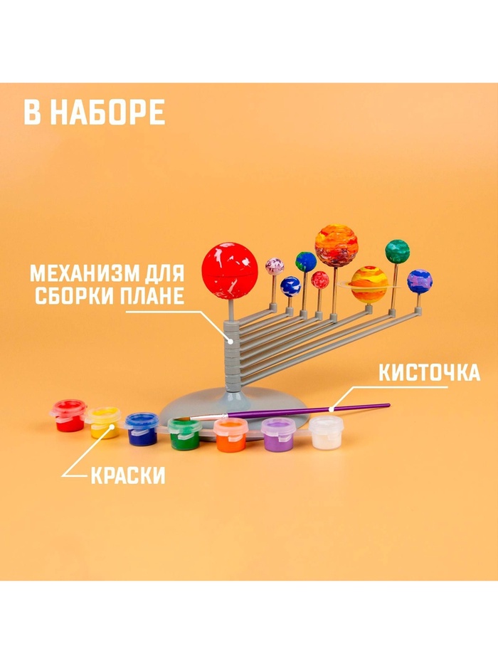Соберите планеты Солнечной системы и раскрасьте их с помощью кисточки, ориентируясь по рисунку на упаковке. После того как небесные тела будут окрашены, установите готовые планеты на специальный держатель — модель Солнечной системы готова!