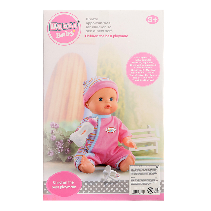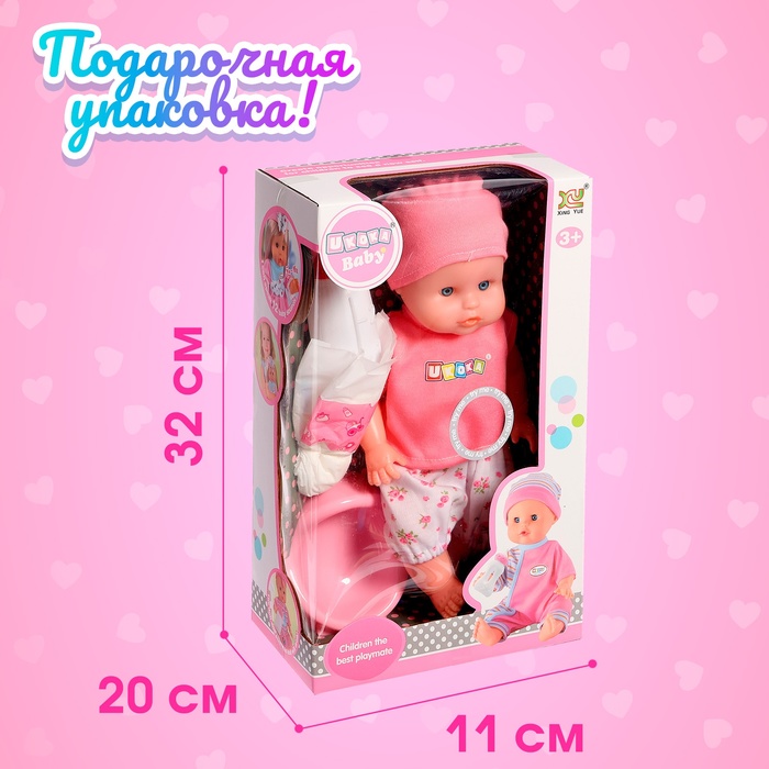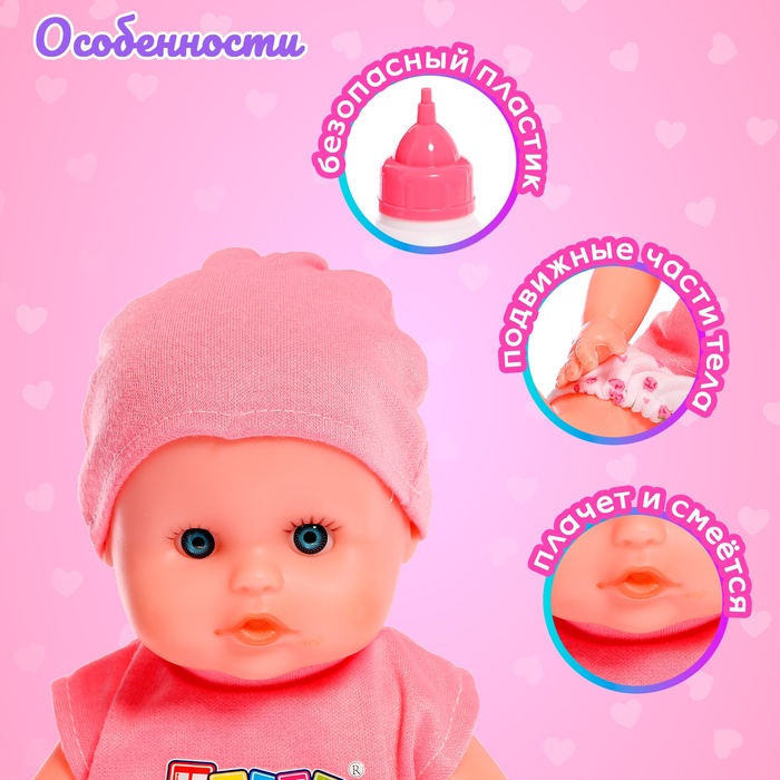 Учить ребёнка заботе и внимательности можно вместе с пупсом «Ангелочек». Малыш будет кормить его, поить, усаживать на горшок, аккуратно укладывать спать, умывать по утрам и водить на прогулку. Кукла смеётся и плачет. Глаза пупса не закрываются. Руки, ноги и голова двигаются.