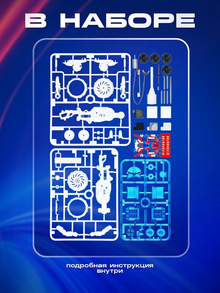- В набор есть всё, чтобы собрать модель: детали, мотор с проводами, колёса, аккумулятор для солевого раствора, наклейки для стилизации мотоцикла.