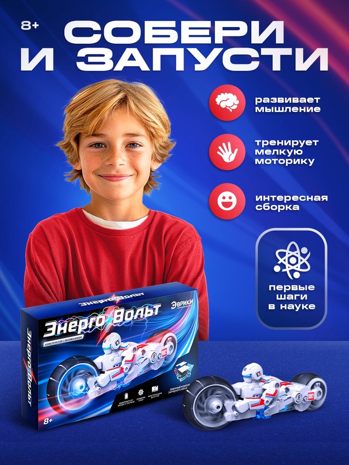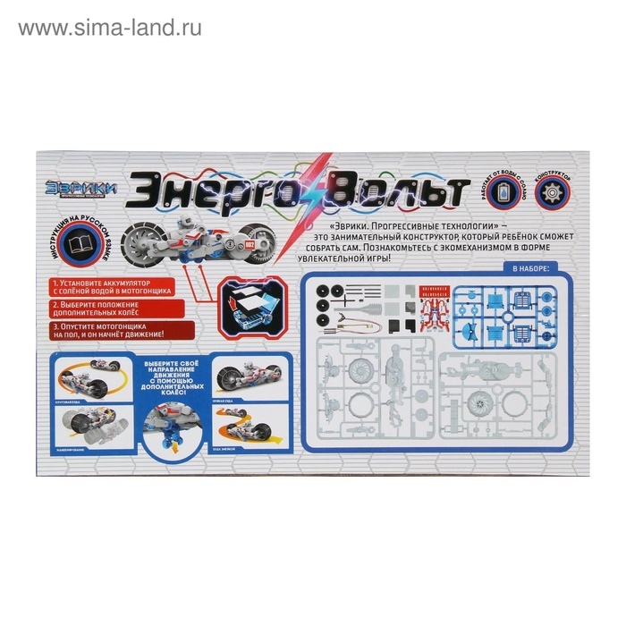 С конструктором «Энерго Вольт» ребёнок познакомится с экомеханизмом, сконструирует неуловимый мотоцикл и приведёт его в движение с помощью соли.