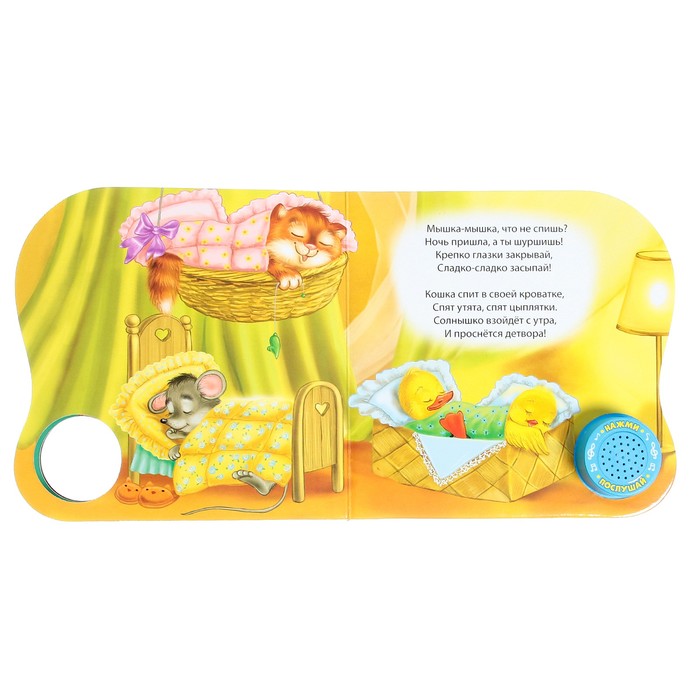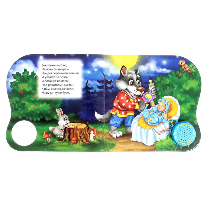 С музыкальной книгой «Колыбельные» засыпать малышу будет легче вдвойне. Уютные картинки и потешки про сон помогут ребёнку настроиться на ночной отдых. На страничках издания вы найдёте знакомые с детства стихи, а ещё послушаете спокойную песенку.