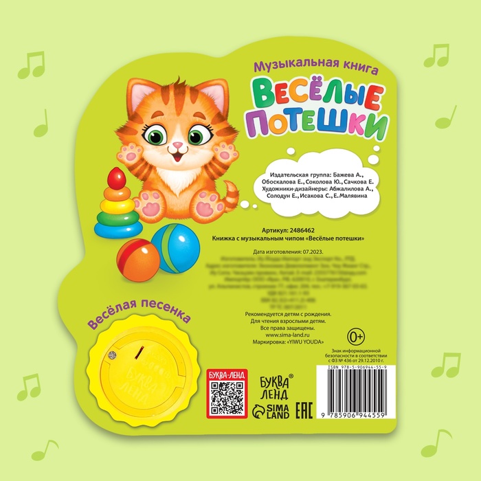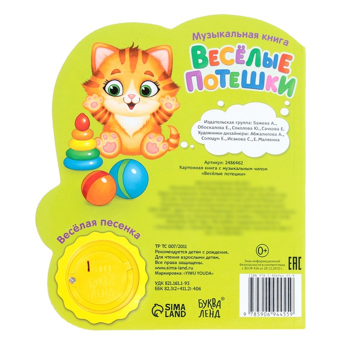 Страницы книги выполнены из плотного картона. Музыкальный чип работает от батареек, входят в комплект. Продолжительность песенки: 20–25 секунд.