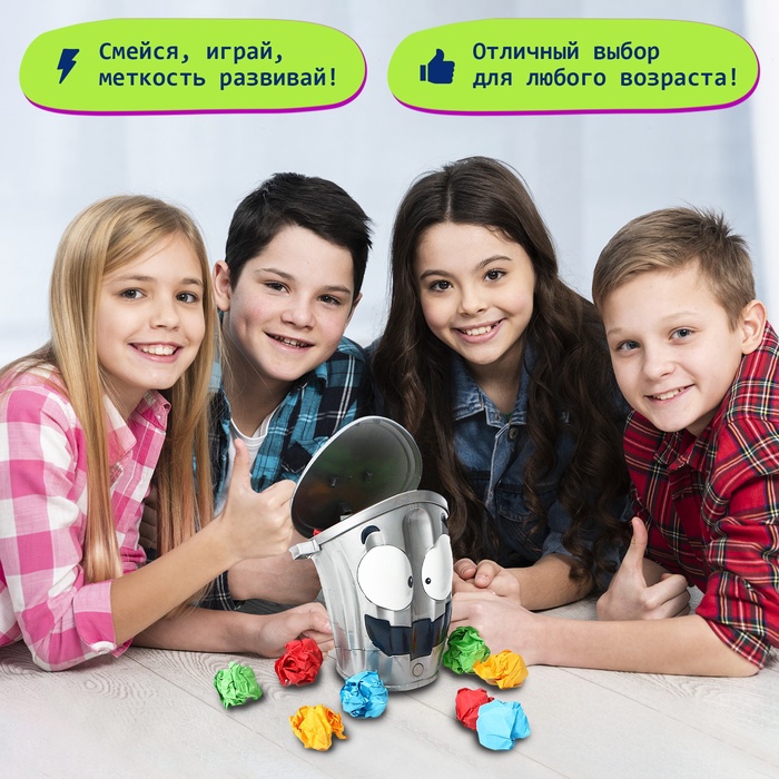 - Скатай шарики из бумаги входящей в набор, выбери цвет и старайся попасть в ведро, когда оно откроется. Первый, кто избавится от всех шариков, побеждает.