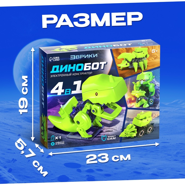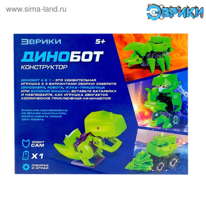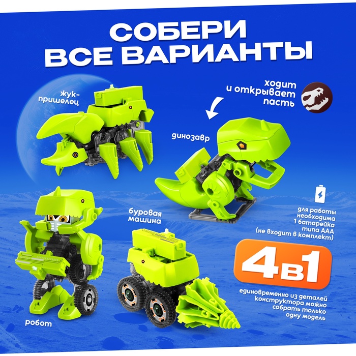 «Динобот» — это электронный конструктор, с 4 вариантами сборки. Игрушка трансформируется в динозавра, робота, жука-пришельца или буровую машину.