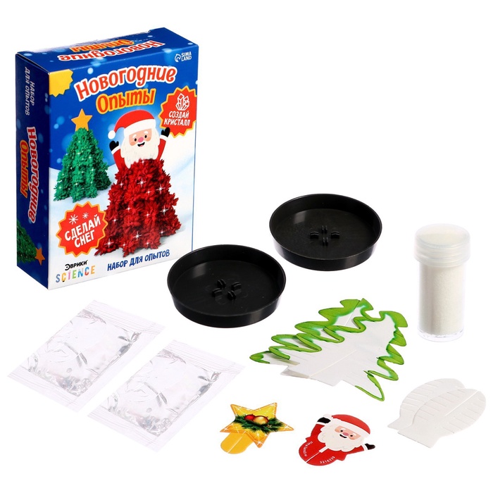 Набор для опытов «Новогодние опыты» — то, что нужно для полезного и интересного досуга! Такой подарок поможет ребёнку скрасить ожидание Нового года, а также позволит создать 2 необычные игрушки и понаблюдать за процессом кристаллизации.