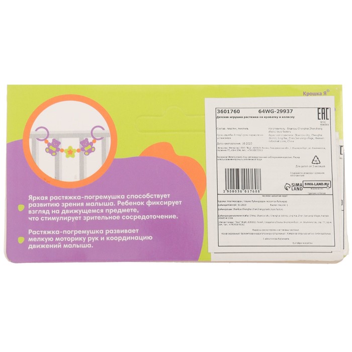 - Растяжка фиксируется на бортике кроватки или коляски с помощью надёжных креплений.