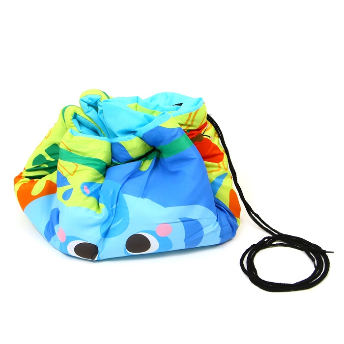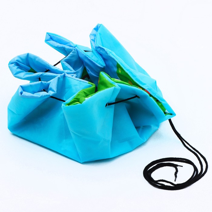- После игры сложите коврик — получится вместительный мешок для игрушек. Простая трансформация без замков и липучек, с которой справятся даже дети.