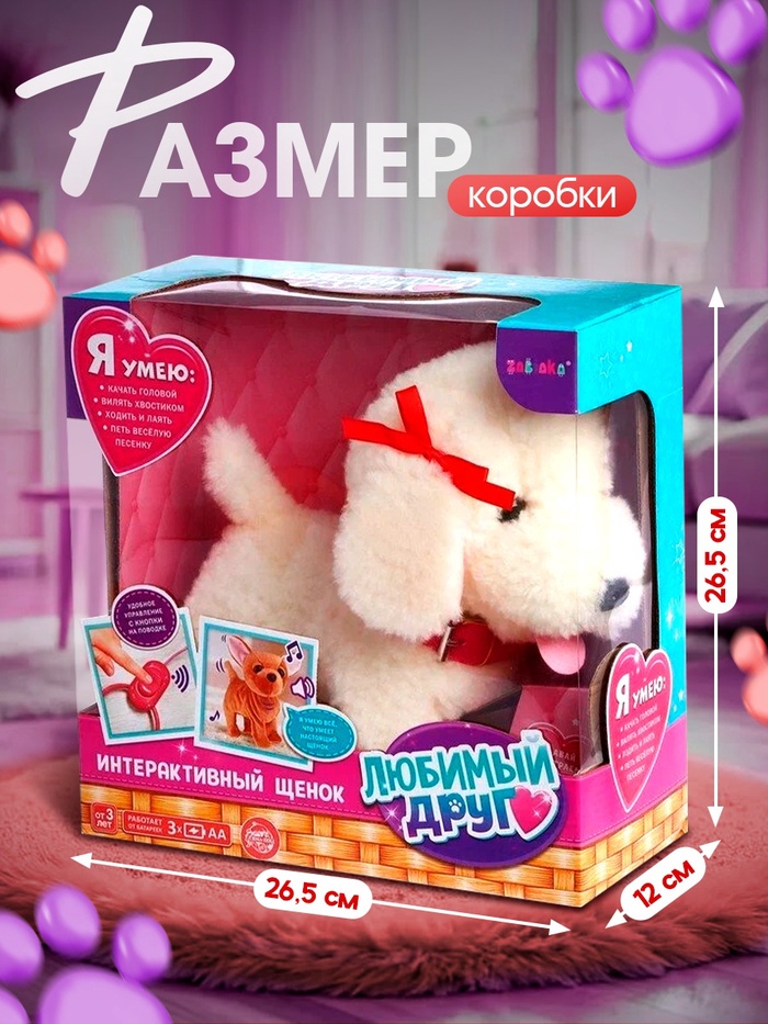 Настоящий друг, который всегда рядом! Интерактивная игрушка «Любимый щенок» — это умная игрушка для детей от 3 лет. Питомец ходит, лает, виляет хвостом и даже поёт весёлые песенки. Управлять им легко — с помощью кнопки на поводке.