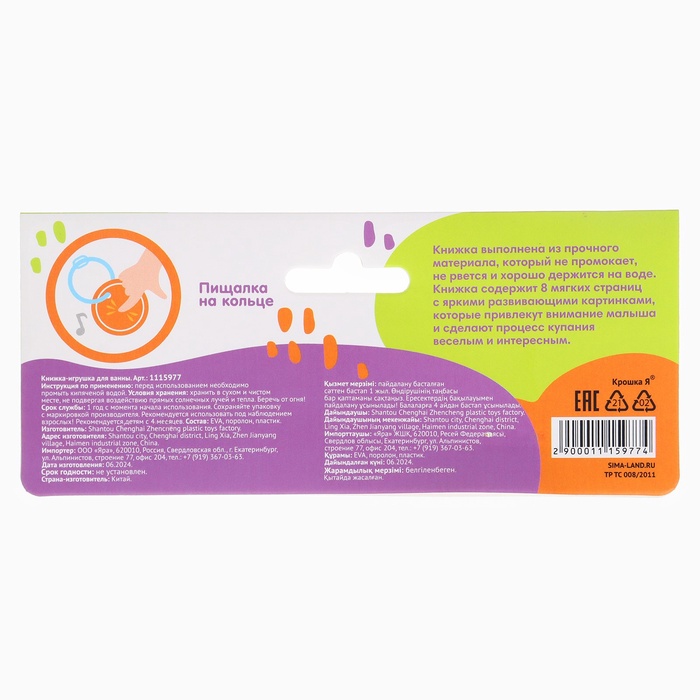 - Книжка выполнена из безопасного материала, который не разрушается под воздействием воды. Она плавает на поверхности, что делает процесс игры комфортным и безопасным для малыша.