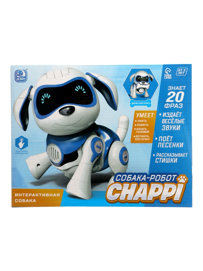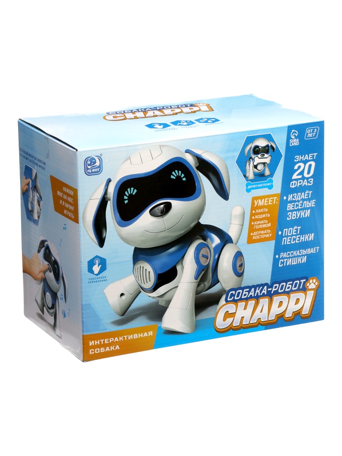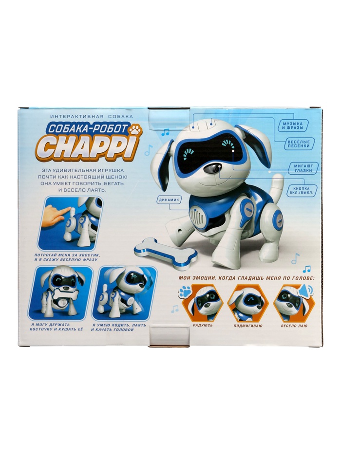 Робот «Чаппи» — прекрасный подарок для детей. Забавный питомец ищет хозяина, который будет любить и заботиться о нём. Милый пёсик умён и талантлив. Он быстро запоминает и превосходно выполняет любые команды, а ещё обожает петь весёлые песни и танцевать. Ребёнок обретёт верного друга и защитника, с которым будет увлекательно проводить время.