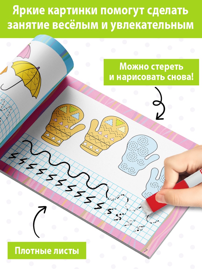 - Многоразовое использование страниц позволяет ребёнку исправлять ошибки, что развивает терпение и внимательность.