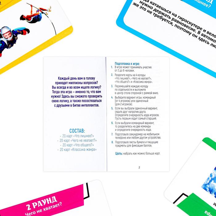 - Что лишнее? На одной стороне карты находится вопрос и картинки, а на другой — ответ. Игрок показывает карту своему сопернику. Задача соперника: за 30 секунд понять, какая из картинок лишняя.