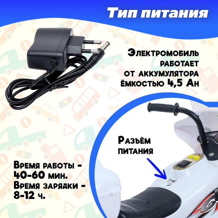 • Электромобиль работает от аккумулятора 4,5 Ah.