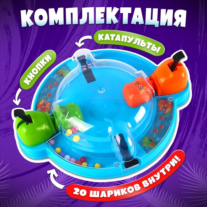 - Положите все шарики из набора в центр поля и по команде ведущего начинайте нажимать на своего бегемота, чтоб он заглатывал шарики.