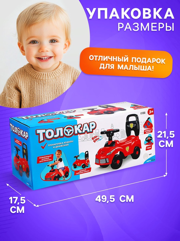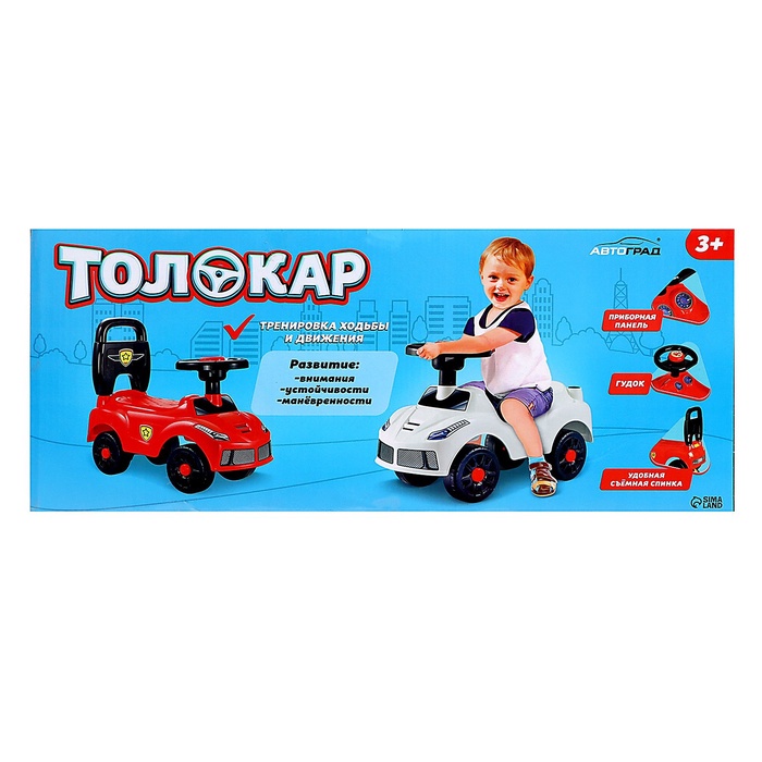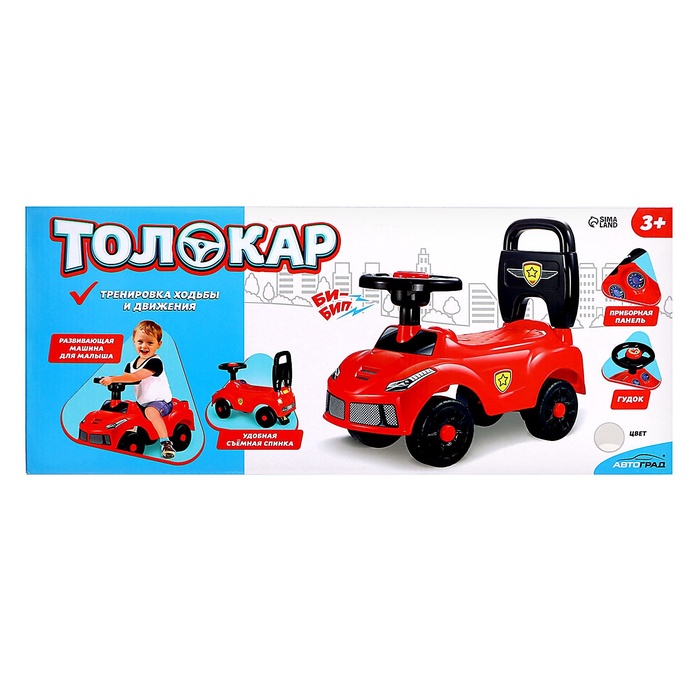 Удобное съёмное сиденье с высокой спинкой для комфортной езды.Лёгкий и компактный, его легко переносить и хранить.Широкие колеса обеспечивают устойчивость и плавный ход.Руль толокара поворачивается на 90 градусов. В него встроена кнопка-гудок, которая срабатывает при нажатии.Изготовлен из качественного пластика, без острых углов. Транспорт имеет устойчивую конструкцию и упор сзади, который не позволит ребёнку перевернуть толокар на себя.Предназначен для детей от 3-х лет.Играем с пользой