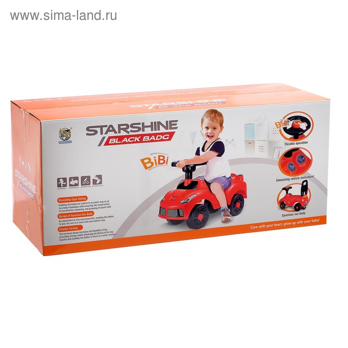 - Лёгкий и компактный, его легко переносить и хранить. Он имеет удобное сиденье и руль, который поворачивается на 90 градусов. В руле встроена кнопка-гудок, которая срабатывает при нажатии.
