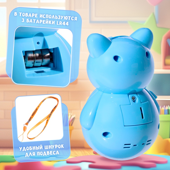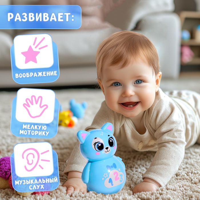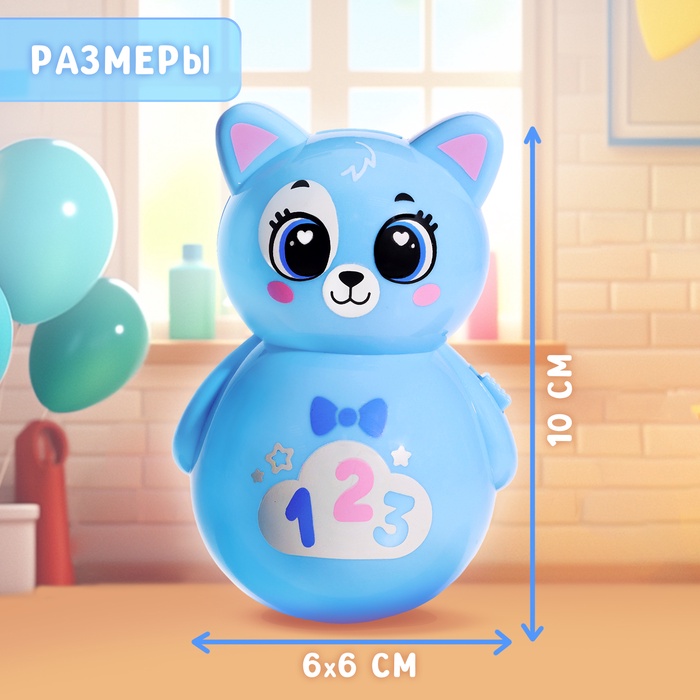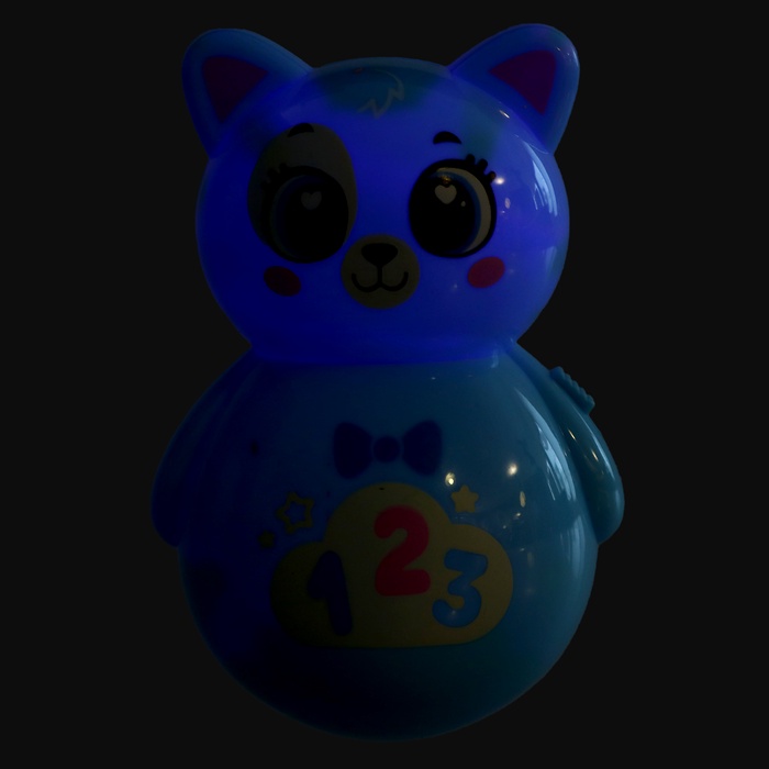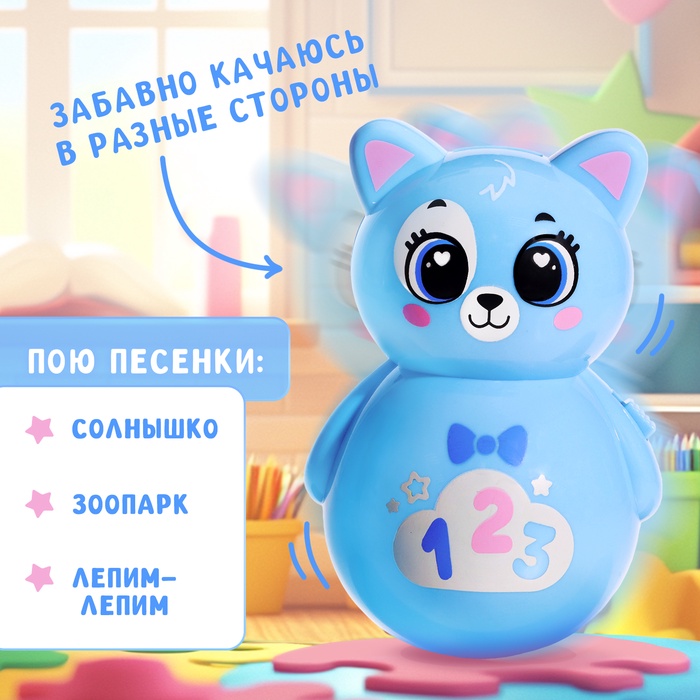 Неваляшка «Весёлый малыш» — это яркая кошка-качалка в голубом цвете, которая поёт песенки и успокаивает ребёнка. Подходит для малышей от 3 месяцев, развивает слух, моторику и воображение. Игрушка светится в темноте, её можно использовать как ночник.