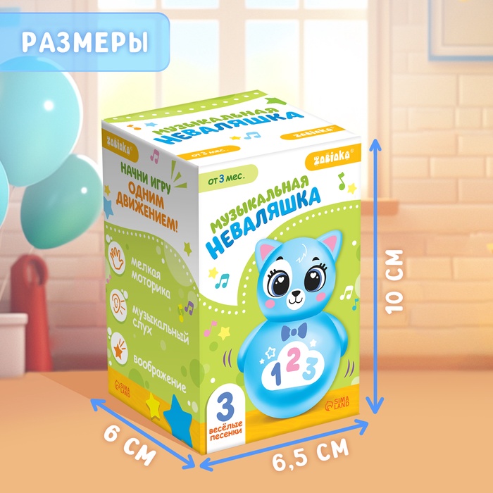 - 3 весёлые песенки: «Солнышко», «Зоопарк» и «Лепим-лепим» — мелодии, которые нравятся малышам. Неваляшка забавно качается, привлекая внимание.