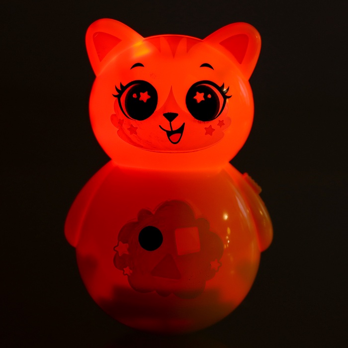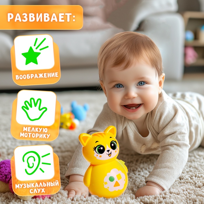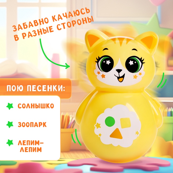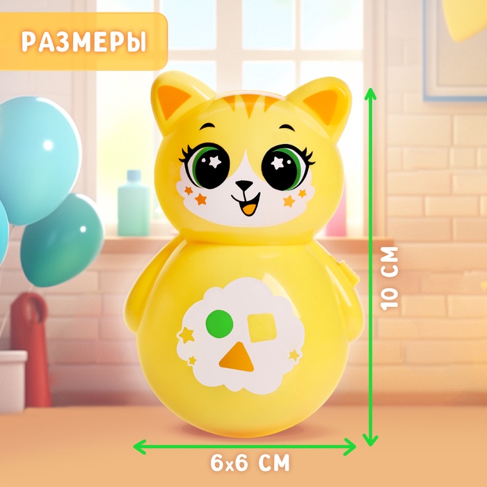 Неваляшка «Весёлый малыш» — это яркая кошка-качалка в жёлтом цвете, которая поёт песенки и успокаивает ребёнка. Подходит для малышей от 3 месяцев, развивает слух, моторику и воображение. Игрушка светится в темноте, её можно использовать как ночник.