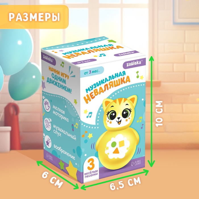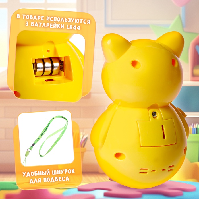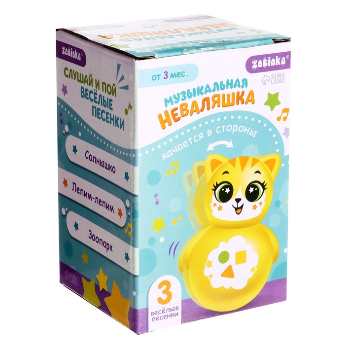 - 3 весёлые песенки: «Солнышко», «Зоопарк» и «Лепим-лепим» — мелодии, которые нравятся малышам. Неваляшка забавно качается, привлекая внимание.