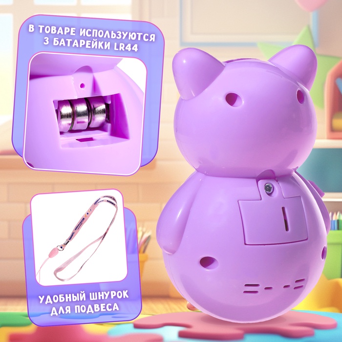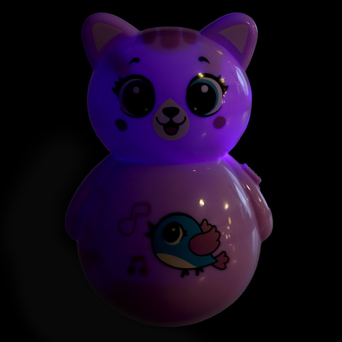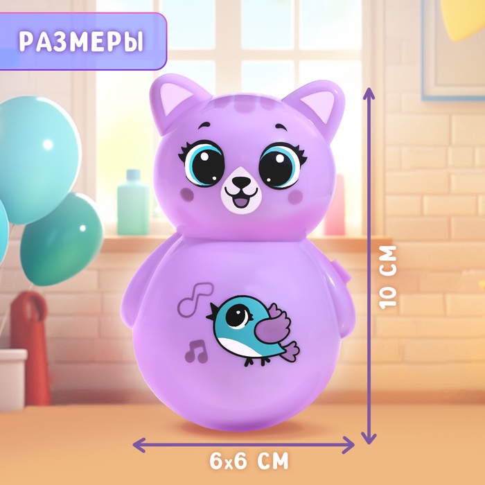 Неваляшка «Весёлый малыш» — это яркая кошка-качалка в фиолетовом цвете, которая поёт песенки и успокаивает ребёнка. Подходит для малышей от 3 месяцев, развивает слух, моторику и воображение. Игрушка светится в темноте, её можно использовать как ночник.