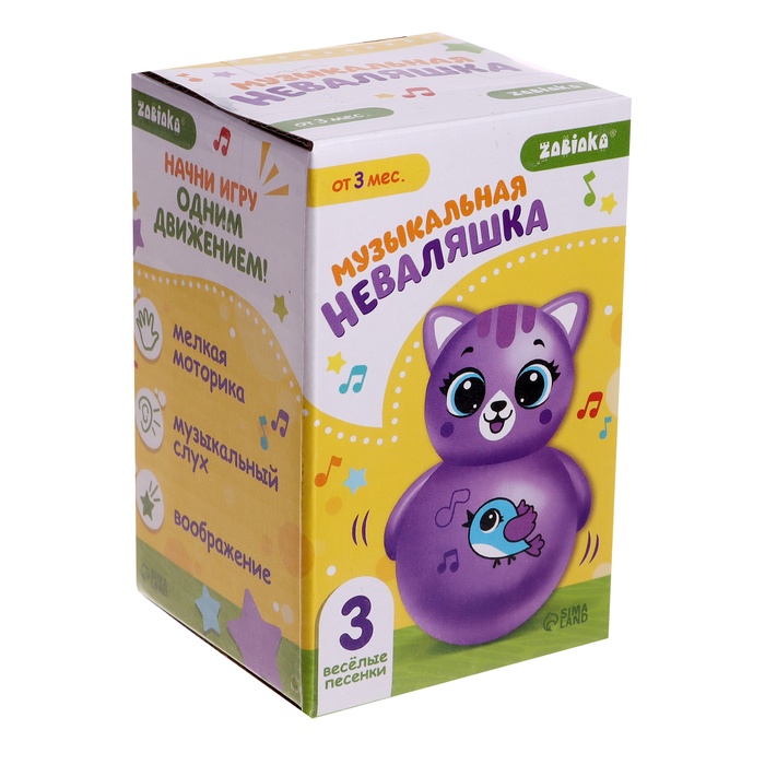 - 3 весёлые песенки: «Солнышко», «Зоопарк» и «Лепим-лепим» — мелодии, которые нравятся малышам. Неваляшка забавно качается, привлекая внимание.