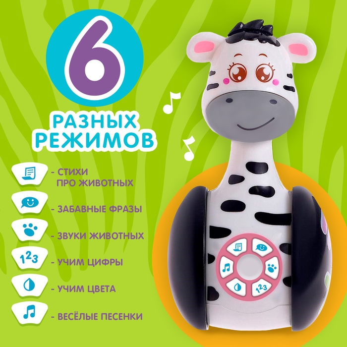 Музыкальная неваляшка «Зебра Гого» — яркая развивающая игрушка для малышей от 1 года. Она сочетает весёлые мелодии, световые эффекты и устойчивую форму, помогая ребёнку познавать мир через игру.