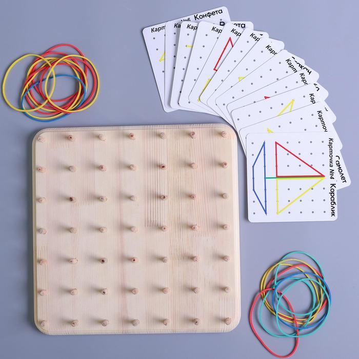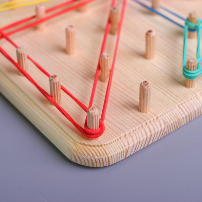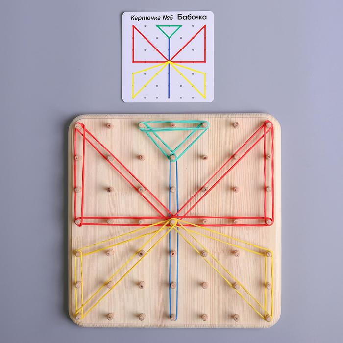 Геоборд — это деревянная доска со штырьками, на которые нужно нанизывать разноцветные резинки. Делайте это в соответствии с заданиями, указанными на карточках или сами придумывайте изображения.