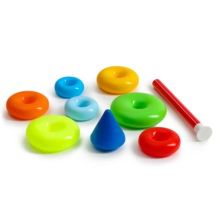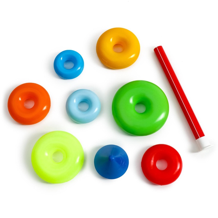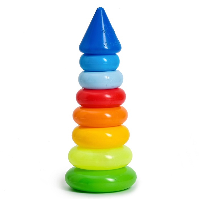 Каждое кольцо разного цвета и пронумеровано. Собирая пирамидку, ребёнок освоит основные цвета радуги и получит базовые навыки счёта. Игры с красочной пирамидкой разовьют у крохи мелкую моторику, координацию движений, воображение, логическое и образное мышление, навыки конструирования. Он научится различать предметы по величине, сравнивать их и делать выводы. Также юный конструктор познакомится с такими понятиями, как «больше», «меньше», «круг», «конус», «плоский», «объёмный».