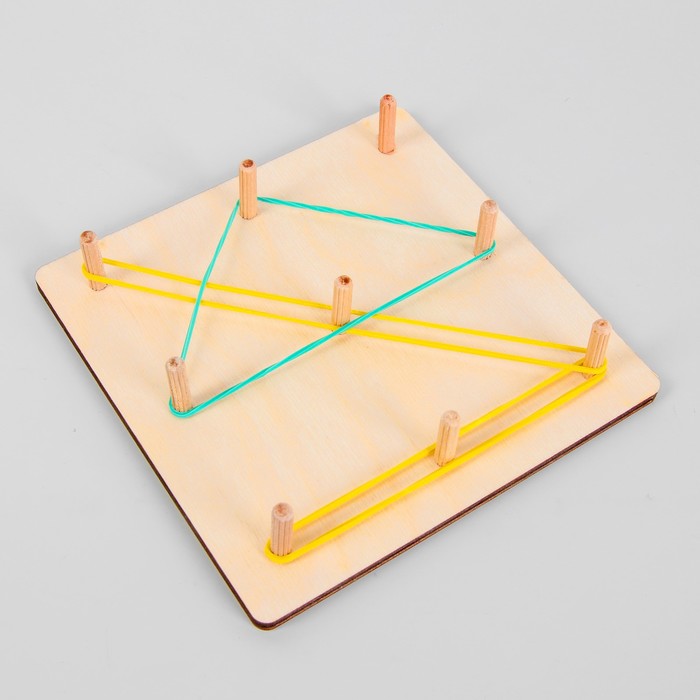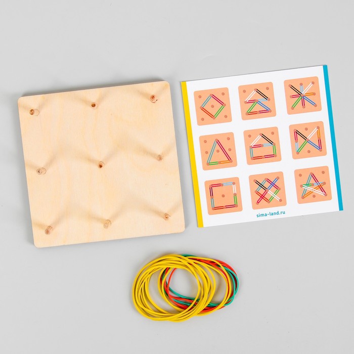 Геоборд представляет собой плоское поле (обычно в форме квадрата или прямоугольника) с равноудаленными друг от друга штырьками. Суть игры - создавать различные фигуры, надевая на штырьки резиночки. Сначала предложите малышу повторить схемы из набора, а затем попросите придумать историю и обыгрывать её с помощью резиночек на геоборде.