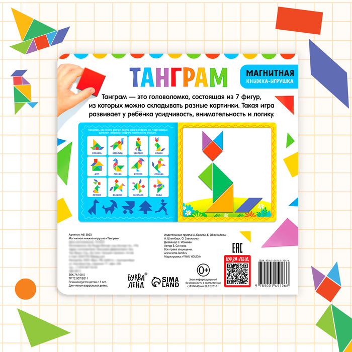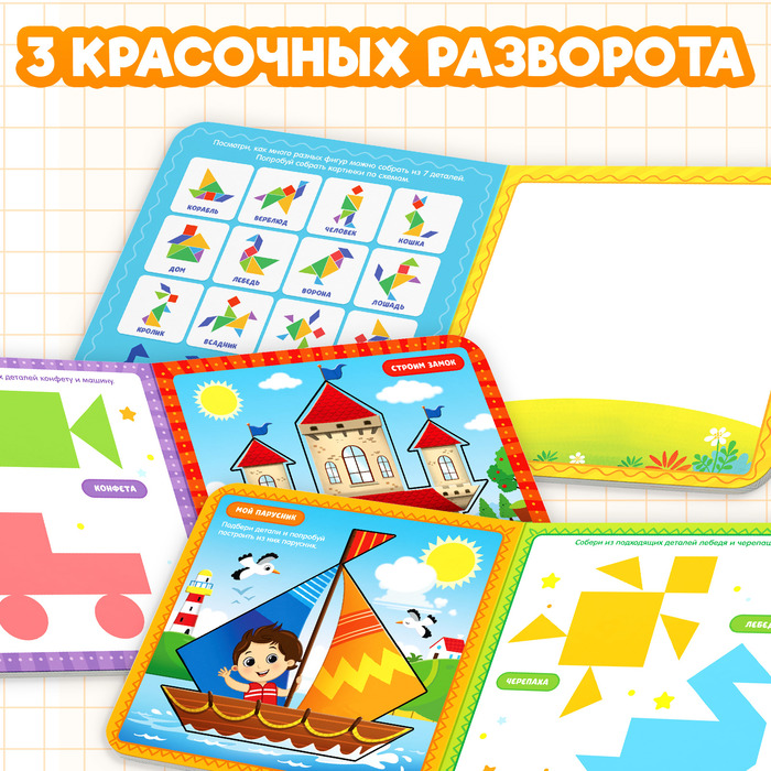 Танграм — это головоломка, состоящая из 7 фигур, из которых можно складывать разные картинки. Такая игра развивает у ребёнка усидчивость, внимательность и логику.