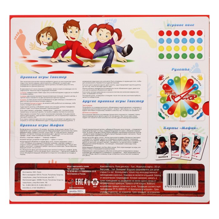 В набор входят 2 популярные захватывающие игры «Твистер» и «Мафия», в которые будет интересно играть и детям от 6 лет, и увлеченным взрослым.