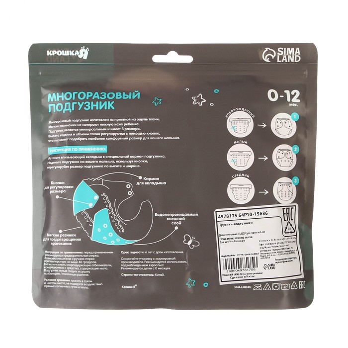 • Размер подгузника универсальный, подходит для детей от 3 до 15 кг, от рождения до 3 лет;