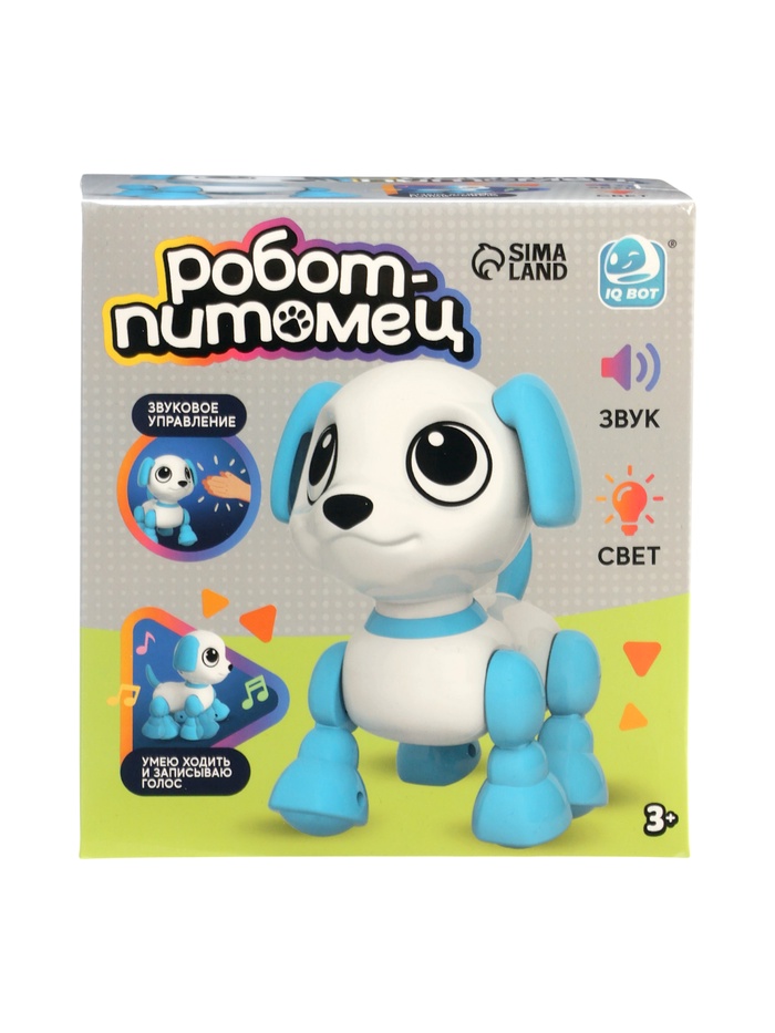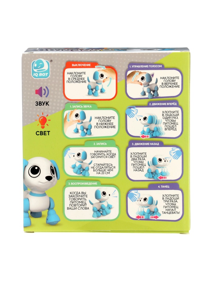 Игрушка оснащена звуковыми датчиками. Питомцем можно управлять с помощью звуков: