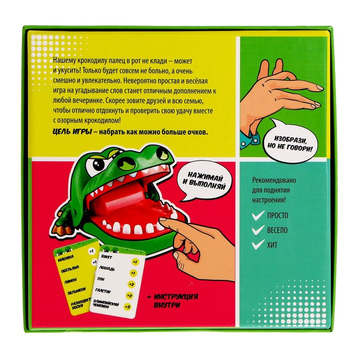 Нажимайте на один из зубов крокодила, чтобы проверить свою удачу. Если нажимаете на «неправильный» зуб — пасть закрывается и вы переходите в следующую игру «Супер-сет». За ограниченное количество времени вы рассказываете участникам 5 слов с карточки. Есть возможность получить сразу 10 баллов. Но если игроки не угадали слова, то все баллы сгорают.