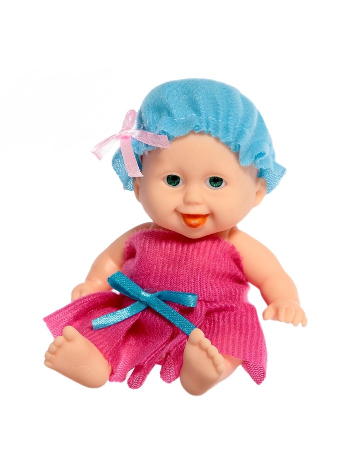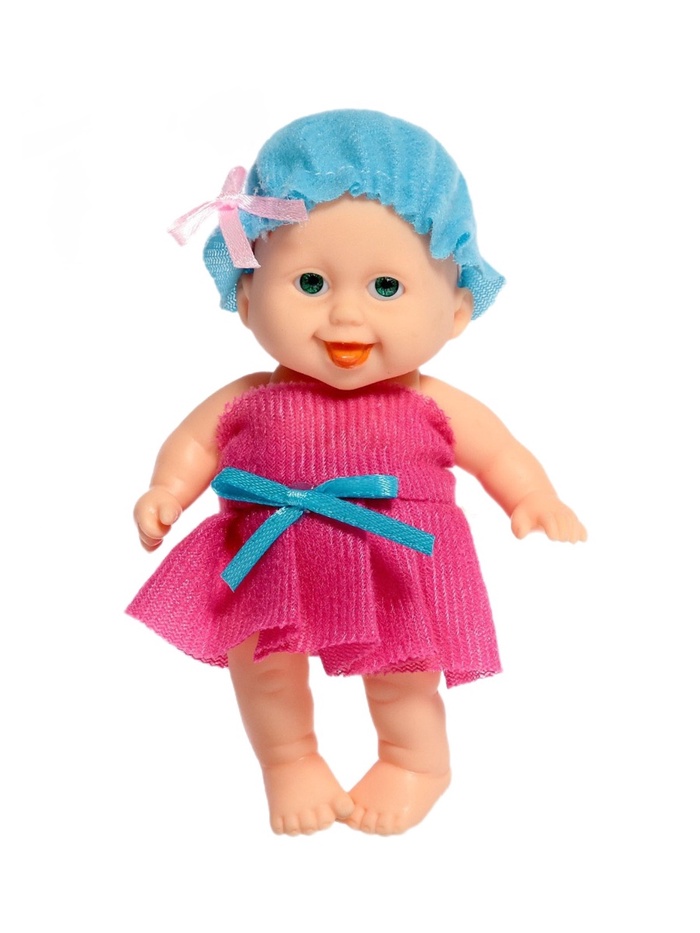У куклы двигаются руки, ноги. Ребёнок придумает множество игр с пупсом и будет учиться заботе и ответственности. Рост куклы — 12 см. Пупсик резиновый. Его можно купать. Одежда снимается.