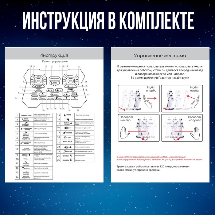 Робот заряжается от USB-кабеля (входит в комплект). Время полной зарядки 2,5–3 часа. Пульт управления работает от 2 батареек типа AA (не входят в комплект).