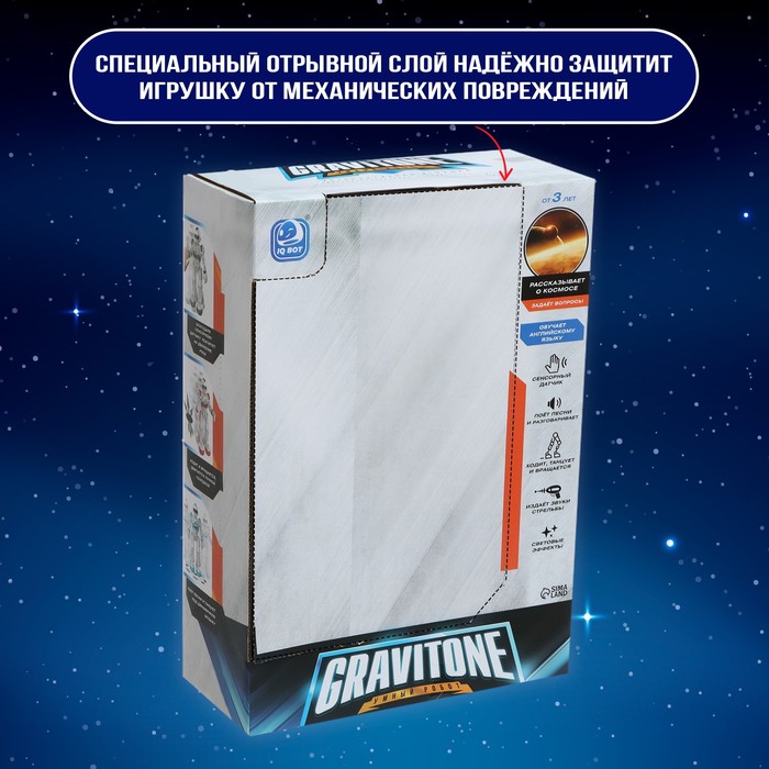 Радиоуправляемый робот IQ BOT GRAVITONE — это интерактивная игрушка для детей от 3 лет. Робот привлекает не только своим футуристичным дизайном, но и функциональными возможностями: он умеет светиться, воспроизводить звуки, говорить на русском языке и даже выполнять простые запрограммированные команды. Отличный выбор для увлекательного досуга и первых шагов в мире технологий!