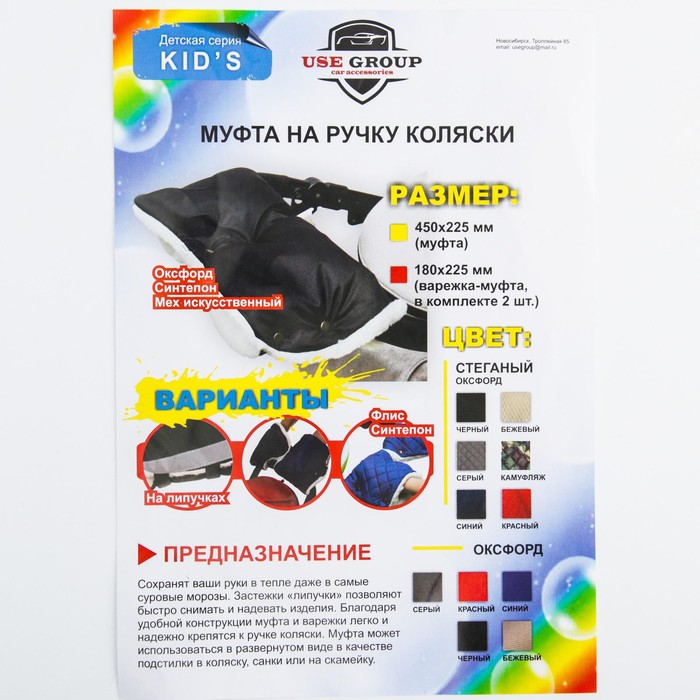 Тёплый аксессуар согреет руки родителей во время зимних прогулок с малышом. Универсальная модель подходит к любой коляске и санкам: оберните её вокруг ручки и застегните застежки. Изделие надёжно защитит от холода и ветра.