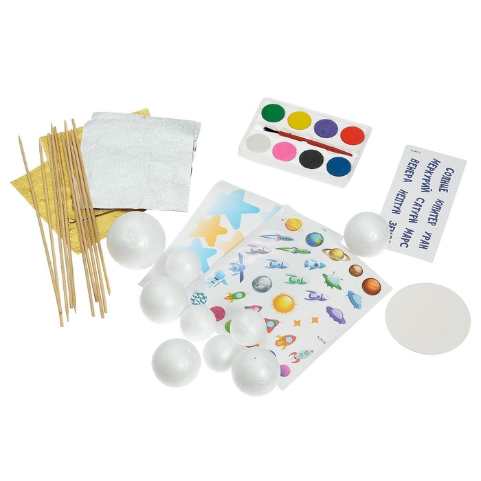 В наборе: пенопластовые шары, палочка, нитки, краски, кисточка, фольга, наклейки, буклет.