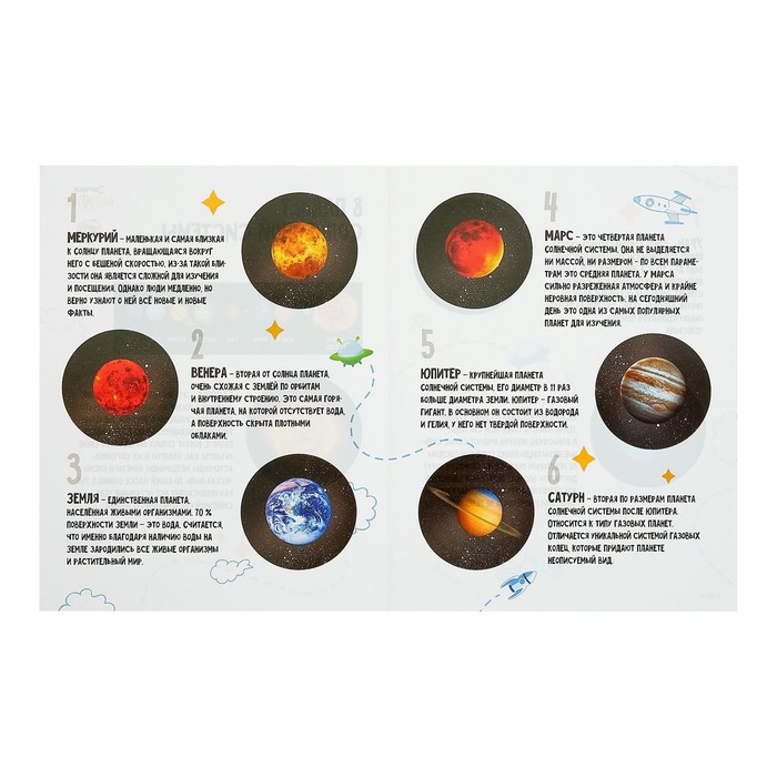 С этим набором ребёнок соберёт модель Солнечной системы по подробной инструкции, изучит расположение и взаимодействие планет в космическом пространстве. Краски и наклейки помогут сделать внешний вид модели реалистичнее. А интересные факты о планетах увлекут ребёнка во время изучения.