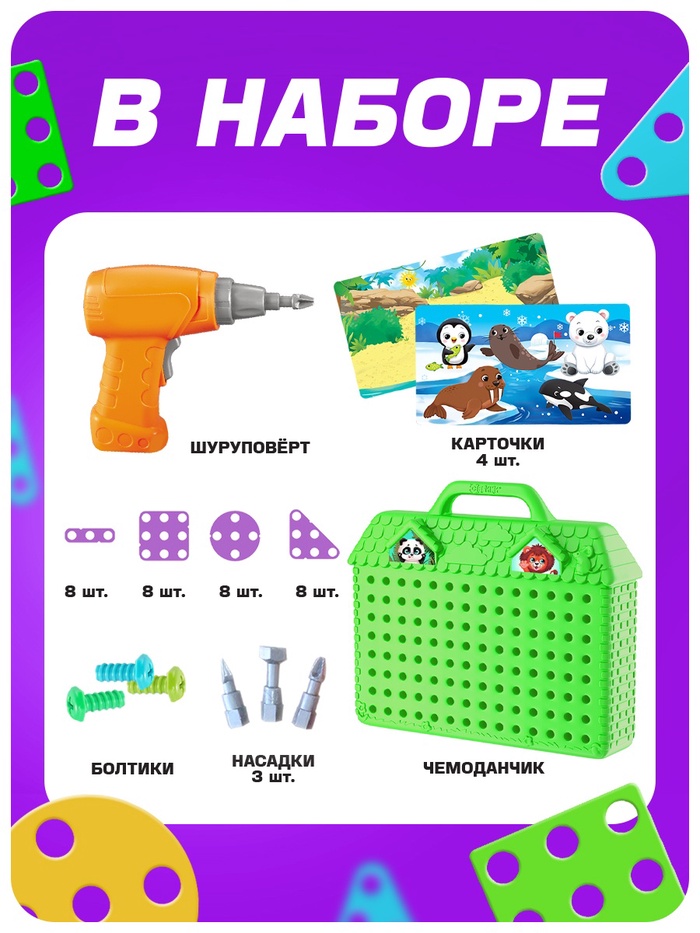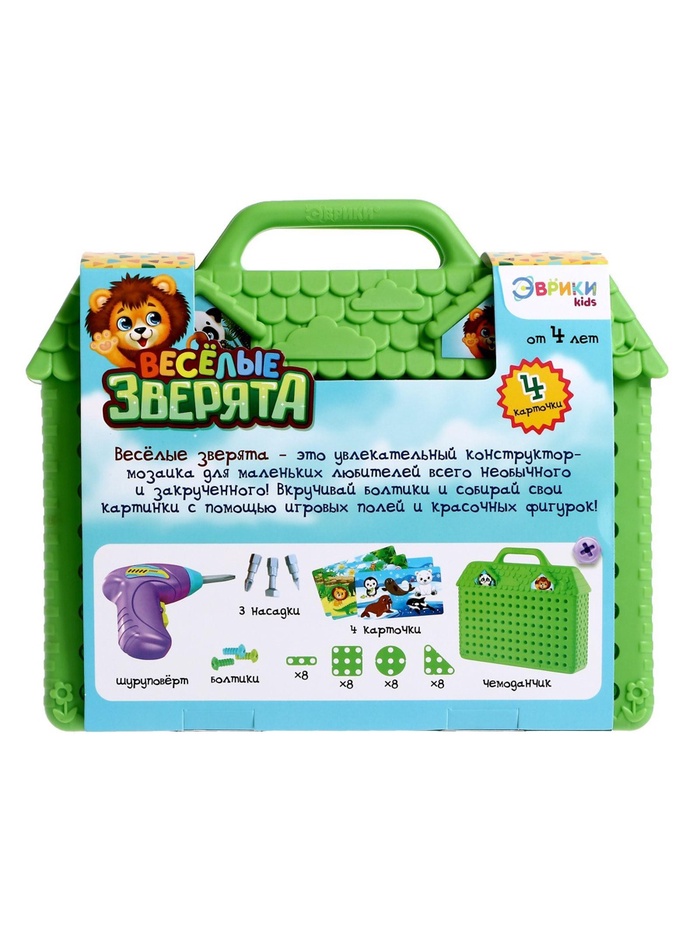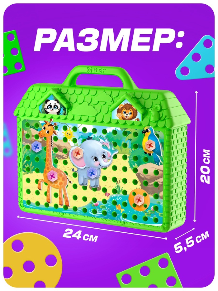 Увлекательный конструктор-мозаика — то, что надо маленьким любителям всего необычного! Задача малыша: вкручивать болтики и собирать картинки с помощью игровых полей и красочных фигурок.