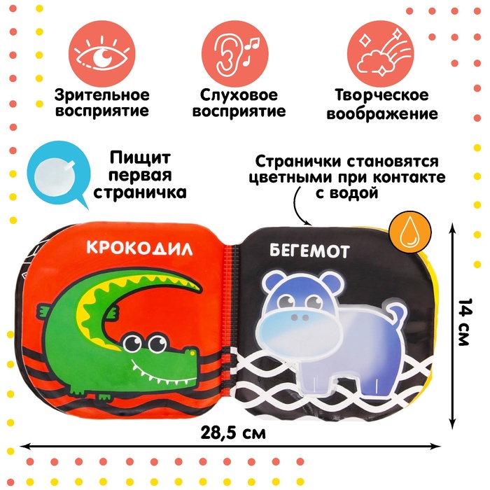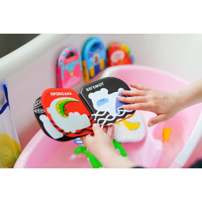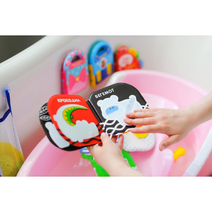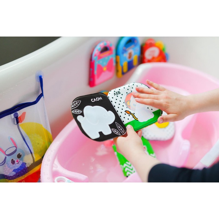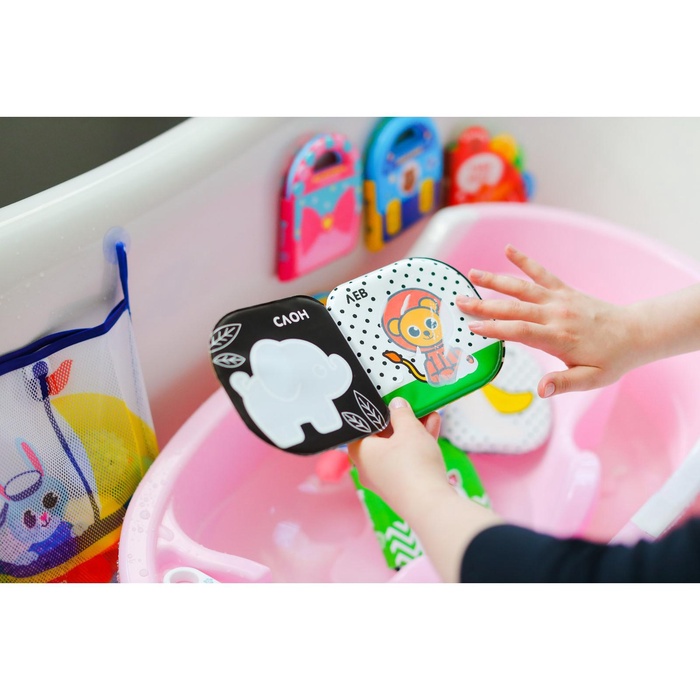 - Книжка выполнена из безопасного материала, который не разрушается под воздействием воды. Она плавает на поверхности, что делает процесс игры комфортным и безопасным для малыша.