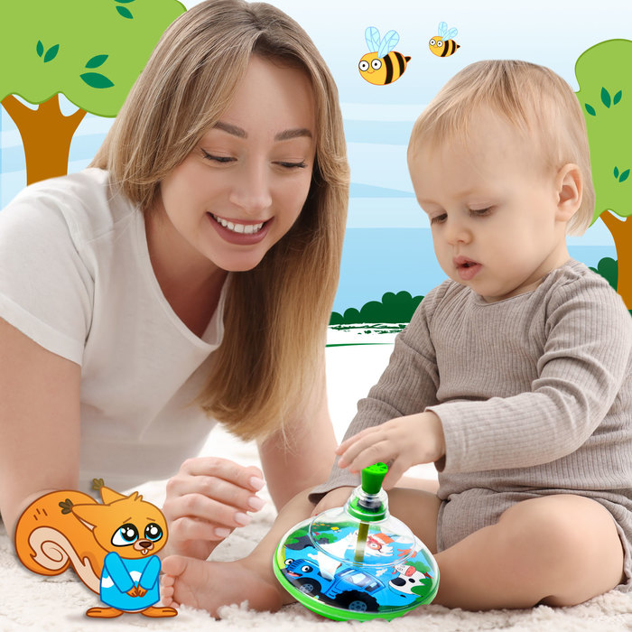 - Юла крутится плавно и долго. Ребёнок будет наблюдать за движением, развивая внимание и координацию.