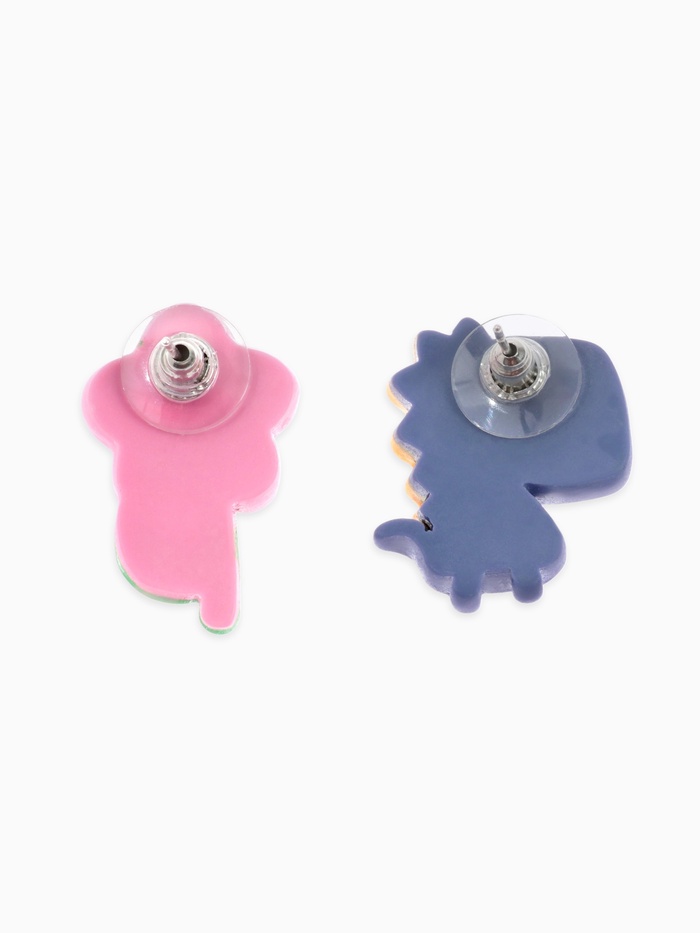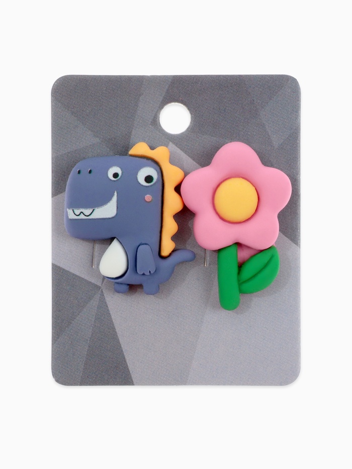 Небольшие серьги с ярким дизайном в сине-розовой гамме объединяют мотивы динозавра и цветка, создавая необычное сочетание для тех, кто ценит оригинальность в аксессуарах. Компактная длина 2 см делает их удобными для повседневного использования и добавляет лёгкую игривость образу.