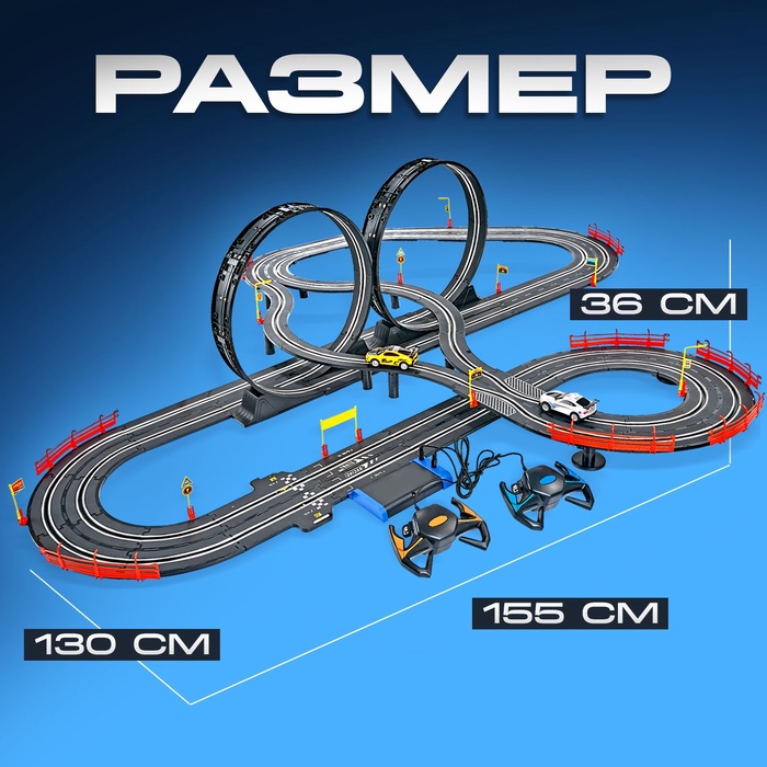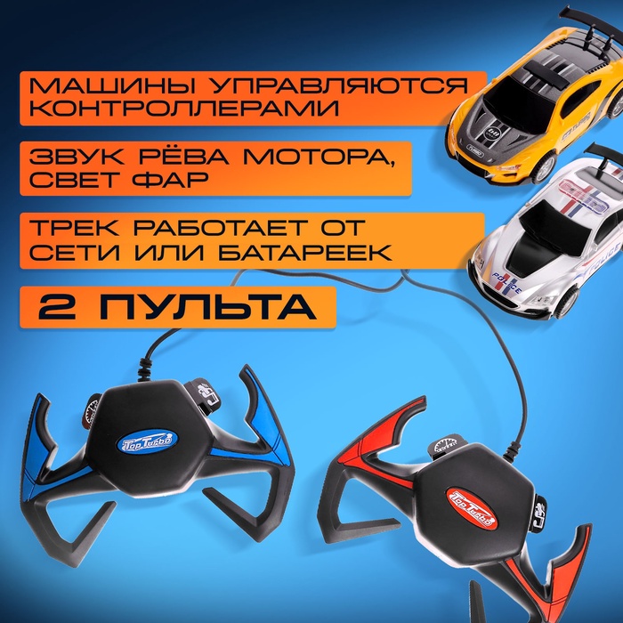 - В комплекте две машинки, обе с самоходным механизмом. Управляются с помощью контроллеров, которые подключаются напрямую к автотреку.