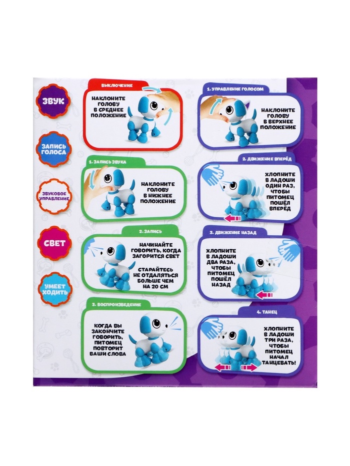 Игрушка оснащена звуковыми датчиками. Питомцем можно управлять с помощью звуков: