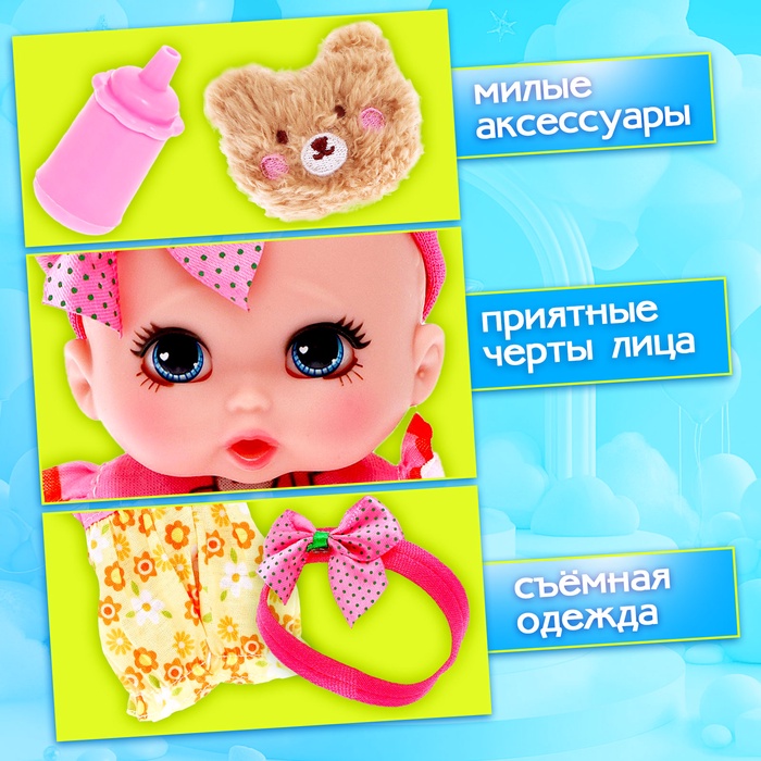 Пупс «Крошка» с аксессуарами — это классическая игрушка, которая учит заботе и развивает воображение. Малышка сможет купать его, переодевать и придумывать уютные истории. Рост куклы — 15 см, что удобно для маленьких ручек.