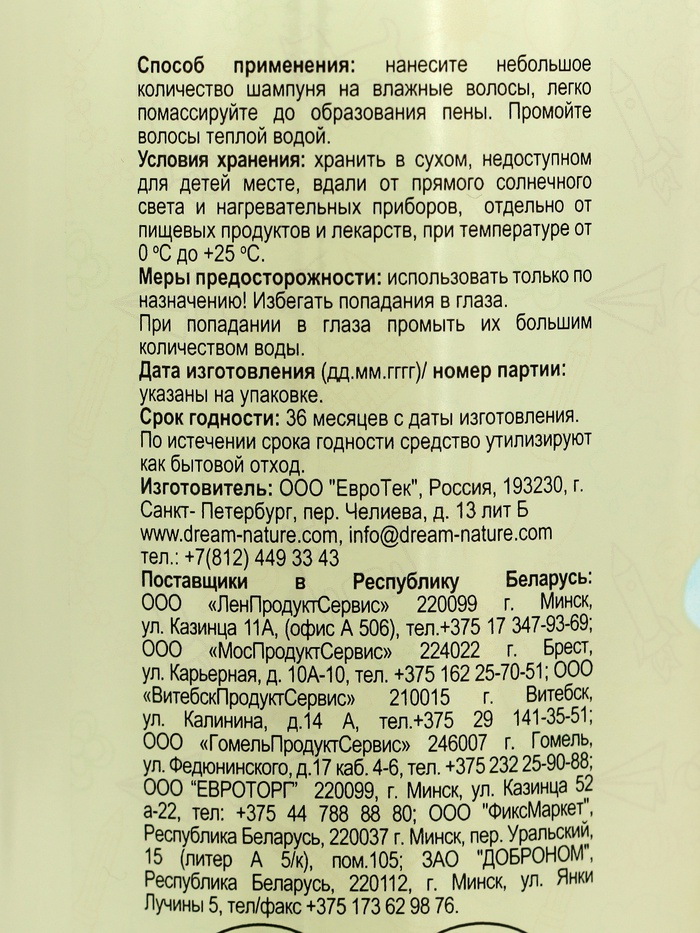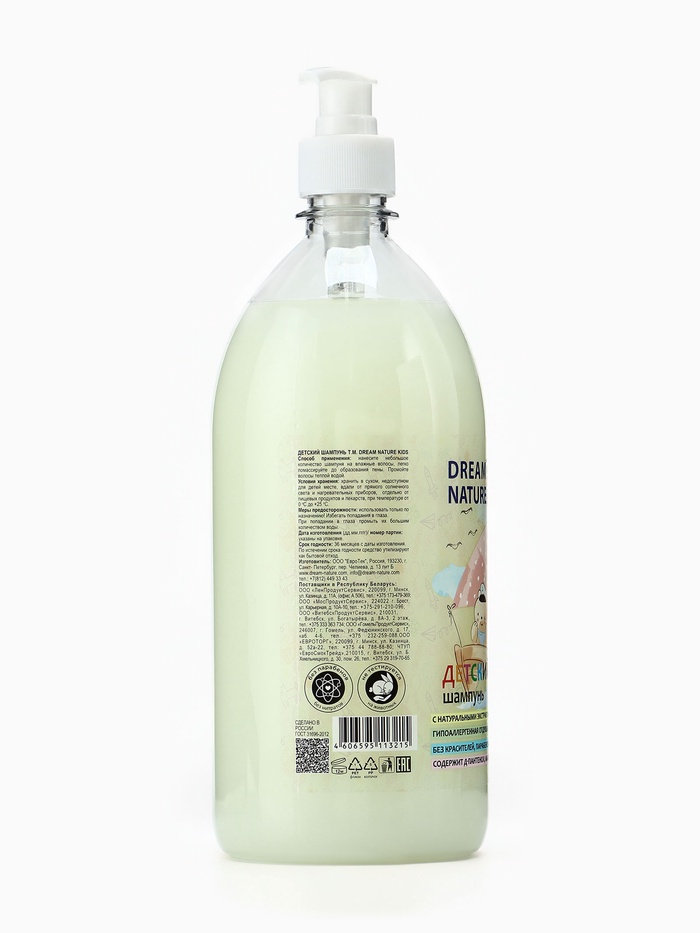 Детский шампунь для волос DREAM NATURE с ромашкой, чередой и календулой — это нежный, мягкий и особенный шампунь для детей. Гипоаллергенная формула на 95 % состоит из ингредиентов натурального происхождения и не щиплет глазки, не содержит красители, парабены и силиконы. Поэтому шампунь можно использовать для ухода за малышами. Витаминный комплекс в составе делает тонкие детские волосы шелковистыми, блестящими и здоровыми после каждого мытья. Д-пантенол и растительные экстракты ромашки, череды и календулы сохраняют уровень влажности кожи головы, смягчают ее, успокаивают раздражения и покраснения. Масло оливы предотвращает спутывание волос и облегчает расчесывание. Детский шампунь DREAM NATURE - для нежной заботы о самом дорогом человеке, которого Вы знаете.